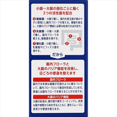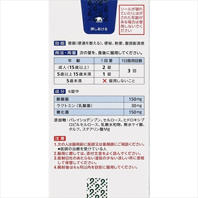 | ◆特 長◆ ビオスリーは小腸から大腸の部位ごとに働く3種の活性菌(「酪酸菌」、「乳酸菌」、「糖化菌」)を配合しています。 腸内フローラと大腸のバリア機能を改善することで、日ごろの便通を整えます。 便秘や軟便にも、日ごろのおなかのケアにも使えます。 のみやすい、やや甘みのある小粒の錠剤です。 ◆メーカー◆ アリナミン製薬株式会社 〒541-0045 大阪市中央区道修町四丁目1番1号 お問合せ 0120-56-7087 受付時間 9:00~17:00(土、日、祝日を除く) ※製造国または原産国:日本 ◆効能・効果◆ 整腸(便通を整える)、便秘、軟便、腹部膨満感 ◆用法・用量◆ 次の量を、食後に服用してください。 成人(15歳以上) 1回2錠、1日3回 5歳以上15歳未満 1回1錠、1日3回 5歳未満は服用しないこと ・用法及び用量に関連する注意 (1)小児に服用させる場合には、保護者の指導監督のもとに服用させてください。 (2)用法・用量を厳守してください ◆成分・分量◆ 6錠中 酪酸菌:150mg ラクトミン(乳酸菌):30mg 糖化菌:150mg 添加物としたバレイショデンプン、セルロース、ヒドロキシプロピルセルロース、乳糖水和物、無水ケイ酸、タルク、ステアリン酸Mgを含有する。 ◆使用上の注意◆ ・相談すること 1 .次の人は服用前に医師又は薬剤師にご相談ください。 医師の治療を受けている人。 2 .次の場合は、服用を中止し、この添付文書を持って医師又は薬剤師にご相談ください。 1か月位服用しても症状がよくならない場合。 ◆保管及び取扱い上の注意◆ (1)直射日光の当たらない湿気の少ない涼しい所に密栓して保管してください。 (2)小児の手の届かない所に保管してください。 (3)他の容器に入れ替えないでください。(誤用の原因や品質が変わるおそれがあります。) (4)本剤は湿気を吸いやすいので、服用のつど必ずフタをかたくしめてください。 (5)ビンの中の上部のつめものは、錠剤がこわれるのを防ぐために入れてありますので、フタを開けた後は取り除いてください。 (6)使用期限をすぎた製品は服用しないでください。 (7)箱とビンの「開封年月日」記入欄に、ビンを開封した日付を記入してください。 (8)一度開封した後は、品質保持の点から開封日より6か月以内を目安になるべくすみやかに服用してください。 |