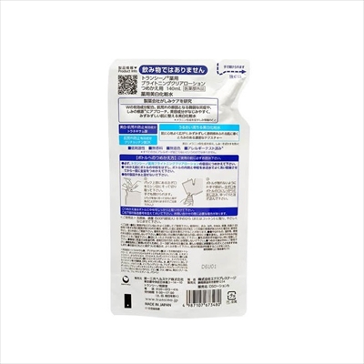 ◆特 長◆ 濃密なローションが肌をやわらかく整え、美容成分がなじみやすいクリアでみずみずしい肌へ導く美白(メラニンの生成を抑え、しみ・そばかすを防ぐ)化粧水 美白・肌荒れ防止有効成分「トラネキサム酸」と肌荒れ防止有効成分「グリチルリチン酸2K」のW配合で、しみの兆しにアプローチ。 くすみ印象(乾燥や影(きめの乱れなどによって周囲の色と比べて暗く見える部分)、毛穴の目立ちなどによる)を引き起こす3つの要因に着目した3種のケア成分を配合。 厳選した美容成分を届け、うるおいで満たすための3段階アプローチ。 肌に心地よく広がるとろみのある濃密なテクスチャー。 つめかえ用 ◆メーカー◆ 第一三共ヘルスケア株式会社 ※製造国または原産国:日本 ◆効能・効果◆ 肌あれ。あれ性。メラニンの生成を抑え、しみ・そばかすを防ぐ。 ◆用法・用量◆ ・ボトルへのつめかえ方 ご使用の前に必ずお読み下さい。 必ず、トランシーノ薬用ブライトニングクリアローションの容器につめかえて下さい。 つめかえ前にボトルの中栓をはずし、ボトルの内側と中栓を水道水でよく洗い乾燥させてから一度に全量をつめかえて下さい。 他の製品や水と混ぜないで下さい。 (1)パック上部にある注ぎ口をミシン目にそって切り取って下さい。手でも開けられます。 (パックを強く持って切ると液が飛ぶことがありますのでご注意下さい。) (2)ボトルが倒れないように片手で固定し、注ぎ口をボトルの口にしっかりと差し込み、ゆっくりと注ぎ込んで下さい。 つめかえ後はボトルに中栓をしっかりと取り付けて下さい。 右下部の製造番号を控えておいて下さい。お問い合わせの際に必要な場合があります。 ・使用方法 洗顔後、適量を手のひら(またはコットン)に取り、やさしくなじませて下さい。 ご使用量の目安:500円硬貨大 ◆成分・分量◆ 有効成分:トラネキサム酸、グリチルリチン酸2K その他の成分:トレハロース、ポリメタクリロイルオキシエチルホスホリルコリン液、ヒキオコシエキス-1、オウバクエキス、クワエキス、D-パンテテインスルホン酸Ca液、シクロヘキサンジカルボン酸ビスエトキシジグリコール、エイジツエキス、セイヨウナシ果汁発酵液、DPG、キサンタンガム、水、濃グリセリン、BG、ジグリセリン、ソルビット液、イソプレングリコール、アルギン酸Na、PEG(80)、ポリオキシブチレンポリオキシエチレンポリオキシプロピレングリセリルエーテル(3B.O.)(8E.O.)(5P.O.)、クエン酸、クエン酸Na、無水エタノール、エタノール、フェノキシエタノール、パラベン ◆使用上の注意◆ 肌に異常が生じていないかよく注意してご使用下さい。使用中に、赤み、はれ、かゆみ、刺激、色抜け(白斑等)や黒ずみ等の異常があらわれた場合、使用した肌に直射日光があたって同様の異常があらわれた場合は、使用を中止し、皮ふ科医にご相談下さい。使用を続けると症状を悪化させることがあります。 傷やはれもの、湿疹等、異常のある部位には使用しないで下さい。 肌の弱い方は腕の内側の皮ふの弱い部分に少量を塗布し、赤みやかゆみが起きないことをご確認下さい。 目に入ったときは直ちに洗い流して下さい。 乳幼児の手の届かない所に保管して下さい。 極端に高温又は低温の所、直射日光の当たる所には保管しないで下さい。 使用後は必ずキャップをしめて下さい。 つめかえ後は早めにご使用下さい。 容器の口もとに液がついた場合は、よくふき取って下さい。成分の結晶が付着することがあります。 |