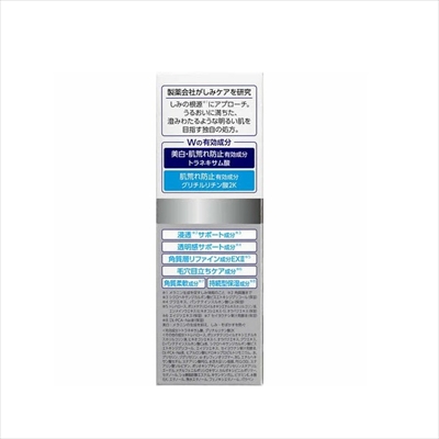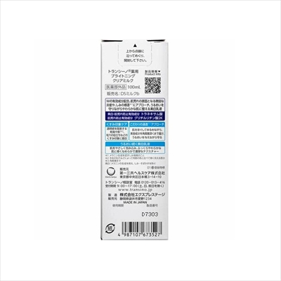 | ◆特 長◆ なめらかな濃厚ミルクが角質層の内側からうるおいで満たし、ふっくら弾力を感じる肌へ導く美白(メラニンの生成を抑え、しみ・そばかすを防ぐ)乳液 美白・肌荒れ防止有効成分「トラネキサム酸」と肌荒れ防止有効成分「グリチルリチン酸2K」のW配合で、しみの兆しにアプローチ。 くすみ印象(乾燥や影(きめの乱れなどによって周囲の色と比べて暗く見える部分)、毛穴の目立ちなどによる)を引き起こす3つの要因に着目した3種のケア成分を配合。 厳選した美容成分を届け、うるおいで守るための3段階アプローチ。 肌をやさしく包み込む、なめらかで濃厚なテクスチャー。 ◆メーカー◆ 第一三共ヘルスケア株式会社 ※製造国または原産国:日本 ◆効能・効果◆ 肌あれ。あれ性。メラニンの生成を抑え、しみ・そばかすを防ぐ。 ◆用法・用量◆ 化粧水などで肌を整えた後、適量を手のひらに取り、やさしくなじませて下さい。 ご使用量の目安:10円硬貨大 ◆成分・分量◆ 有効成分:トラネキサム酸、グリチルリチン酸2K その他の成分:トレハロース、ポリメタクリロイルオキシエチルホスホリルコリン液、ヒキオコシエキス-1、オウバクエキス、クワエキス、D-パンテテインスルホン酸Ca液、シクロヘキサンジカルボン酸ビスエトキシジグリコール、エイジツエキス、セイヨウナシ果汁発酵液、DL-PCA・Na液、ヒアルロン酸ヒドロキシプロピルトリモニウム、水、グリセリン、ジグリセリン、a-オレフィンオリゴマー、BG、エチルヘキサン酸セチル、ステアリン酸PEG、水添大豆リン脂質、PEG(30)、ステアリン酸ソルビタン、ポリオキシブチレンポリグリセリンステアリルエーテル、メチルフェニルポリシロキサン、カルボキシビニルポリマー、セタノール、ショ糖脂肪酸エステル、キサンタンガム、ビタミンE、水酸化K、エタノール、無水エタノール、フェノキシエタノール、パラベン ◆使用上の注意◆ 肌に異常が生じていないかよく注意してご使用下さい。使用中に、赤み、はれ、かゆみ、刺激、色抜け(白斑等)や黒ずみ等の異常があらわれた場合、使用した肌に直射日光があたって同様の異常があらわれた場合は、使用を中止し、皮ふ科医にご相談下さい。使用を続けると症状を悪化させることがあります。 傷やはれもの、湿疹等、異常のある部位には使用しないで下さい。 肌の弱い方は腕の内側の皮ふの弱い部分に少量を塗布し、赤みやかゆみが起きないことをご確認下さい。 目に入ったときは直ちに洗い流して下さい。 乳幼児の手の届かない所に保管して下さい。 極端に高温又は低温の所、直射日光の当たる所には保管しないで下さい。 使用後は必ずキャップをしめて下さい。 開封後は早めにご使用下さい。 容器の口もとに液がついた場合は、よくふき取って下さい。成分の結晶が付着することがあります。 |
