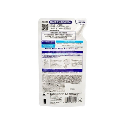 ◆特 長◆ なめらかな濃厚ミルクが角質層の内側からうるおいで満たし、ふっくら弾力を感じる肌へ導く美白(メラニンの生成を抑え、しみ・そばかすを防ぐ)乳液 美白・肌荒れ防止有効成分「トラネキサム酸」と肌荒れ防止有効成分「グリチルリチン酸2K」のW配合で、しみの兆しにアプローチ。 くすみ印象(乾燥や影(きめの乱れなどによって周囲の色と比べて暗く見える部分)、毛穴の目立ちなどによる)を引き起こす3つの要因に着目した3種のケア成分を配合。 厳選した美容成分を届け、うるおいで守るための3段階アプローチ。 肌をやさしく包み込む、なめらかで濃厚なテクスチャー。 つめかえ用 ◆メーカー◆ 第一三共ヘルスケア株式会社 ※製造国または原産国:日本 ◆効能・効果◆ 肌あれ。あれ性。メラニンの生成を抑え、しみ・そばかすを防ぐ。 ◆用法・用量◆ ・ボトルへのつめかえ方 ご使用の前に必ずお読み下さい。 必ず、トランシーノ薬用ブライトニングクリアミルクの容器につめかえて下さい。 つめかえ前にボトルの中栓をはずし、ボトルの内側と中栓を水道水でよく洗い乾燥させてから一度に全量をつめかえて下さい。 他の製品や水と混ぜないで下さい。 (1)パック上部にある注ぎ口をミシン目にそって切り取って下さい。手でも開けられます。 (パックを強く持って切ると液が飛ぶことがありますのでご注意下さい。) (2)ボトルが倒れないように片手で固定し、注ぎ口をボトルの口にしっかりと差し込み、ゆっくりと注ぎ込んで下さい。 つめかえ後はボトルに中栓をしっかりと取り付けて下さい。 右下部の製造番号を控えておいて下さい。お問い合わせの際に必要な場合があります。 ・使用方法 化粧水などで肌を整えた後、適量を手のひらに取り、やさしくなじませて下さい。 ご使用量の目安:10円硬貨大 ◆成分・分量◆ 有効成分:トラネキサム酸、グリチルリチン酸2K その他の成分:トレハロース、ポリメタクリロイルオキシエチルホスホリルコリン液、ヒキオコシエキス-1、オウバクエキス、クワエキス、D-パンテテインスルホン酸Ca液、シクロヘキサンジカルボン酸ビスエトキシジグリコール、エイジツエキス、セイヨウナシ果汁発酵液、DL-PCA・Na液、ヒアルロン酸ヒドロキシプロピルトリモニウム、水、グリセリン、ジグリセリン、a-オレフィンオリゴマー、BG、エチルヘキサン酸セチル、ステアリン酸PEG、水添大豆リン脂質、PEG(30)、ステアリン酸ソルビタン、ポリオキシブチレンポリグリセリンステアリルエーテル、メチルフェニルポリシロキサン、カルボキシビニルポリマー、セタノール、ショ糖脂肪酸エステル、キサンタンガム、ビタミンE、水酸化K、エタノール、無水エタノール、フェノキシエタノール、パラベン ◆使用上の注意◆ 肌に異常が生じていないかよく注意してご使用下さい。使用中に、赤み、はれ、かゆみ、刺激、色抜け(白斑等)や黒ずみ等の異常があらわれた場合、使用した肌に直射日光があたって同様の異常があらわれた場合は、使用を中止し、皮ふ科医にご相談下さい。使用を続けると症状を悪化させることがあります。 傷やはれもの、湿疹等、異常のある部位には使用しないで下さい。 肌の弱い方は腕の内側の皮ふの弱い部分に少量を塗布し、赤みやかゆみが起きないことをご確認下さい。 目に入ったときは直ちに洗い流して下さい。 乳幼児の手の届かない所に保管して下さい。 極端に高温又は低温の所、直射日光の当たる所には保管しないで下さい。 使用後は必ずキャップをしめて下さい。 つめかえ後は早めにご使用下さい。 容器の口もとに液がついた場合は、よくふき取って下さい。成分の結晶が付着することがあります。 |