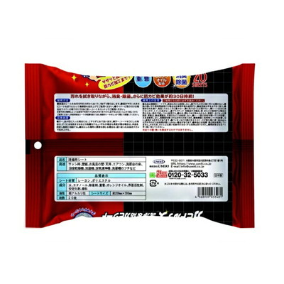 | ◆特 長◆ ウェットタイプのシートで汚れを拭き取りながら、消臭・除菌。さらに防カビ効果が約30日持続! サッシ枠、壁紙、お風呂の壁・天井、エアコン、洗面台の床、浴室乾燥機、加湿機、空気清浄機、洗濯槽のフチなどに。 シートは汚れのかき取り効果に優れた、大判厚手(20cm×30cm)のダイヤカットシートを採用。1枚でしっかり拭くことができます。 カビトルデス 洗浄&防カビシート 20枚入 ※全ての菌・臭いを除去するわけではありません。 ◆メーカー(※製造国または原産国)◆ 株式会社UYEKI(ウエキ) ※製造国または原産国:日本 ◆ご使用方法◆ 表面のシールを矢印(OPEN)の所からめくり、1枚ずつ取り出します。 拭きやすい大きさにシートを折りたたんで清掃面を拭き上げてご使用ください。 ワイパーに取り付ける場合はワイパーの取り付け方法に従い、シートをセットしてご使用ください。 ※壁や床の種類によっては変色や色落ちする恐れがありますので、必ず目立たないところで試してからご使用ください。 ※使用後はシートの乾燥を防ぐため、表面のシールをしっかり閉じて保管してください。 ◆成分、素材◆ 水、エタノール、除菌剤、重曹、オレンジオイル、界面活性剤、安定化剤、香料 ◆使用上の注意◆ 本品は清掃用シートです。用途以外には使用しない。 子どもの手の届く所には置かない。 肌の弱い方や長期間使用する場合は炊事用手袋を使用する。 使用後は手を水でよく洗う。 直射日光を避け、高温となるところに置かない。 火気の近くには置かない。 シートは水に溶けないので、トイレに流さない。 プラスチック・布製品や木製品、壁・床などに使用する場合は目立たない部分で試してから使用する。 白木、桐など水が染み込むもの、漆塗り、古くなった塗装面、革製品、貴金属製品、天然石などには使用しない。 シート面に砂粒や硬いゴミが付着したまま使用しない。清掃面を傷つけるおそれがあります。 清掃面に長時間シートを放置しない。変色するおそれがあります。 パッキンなどの根の生えたカビ、ひび割れ等に深く染み込んだ汚れやカビには効果が感じられない場合があります。 本品には塩素・漂白剤は使用していません。そのため、カビによる黒い色素汚れを白くする効果はありません。 開封後はなるべく早く使い切ってください。 ・応急処置 万一、液が目に入った場合には、こすらずに水で洗い流す。 万一、シートを口にした場合は、すぐに水を飲ませるなどの処置をする。いずれの場合も異常が残る場合は、本品を持参し医師に相談する。 加工した場所に異常を感じる場合は、固く絞った水拭きタオルで拭き上げる。 |