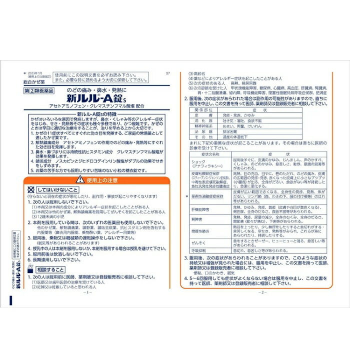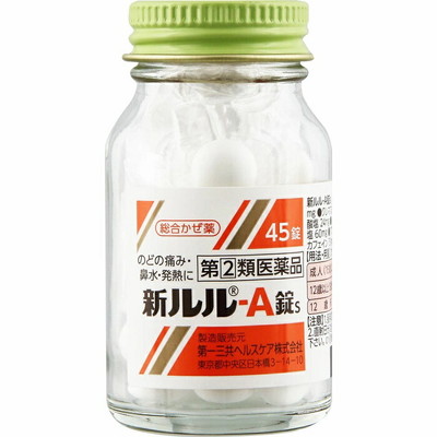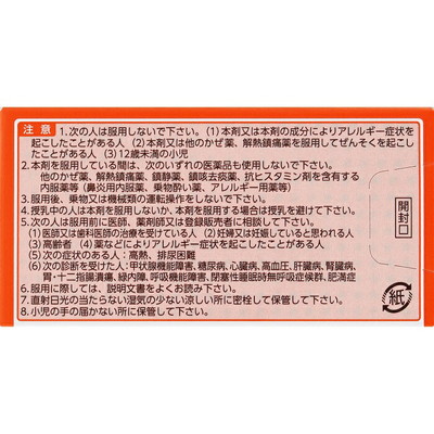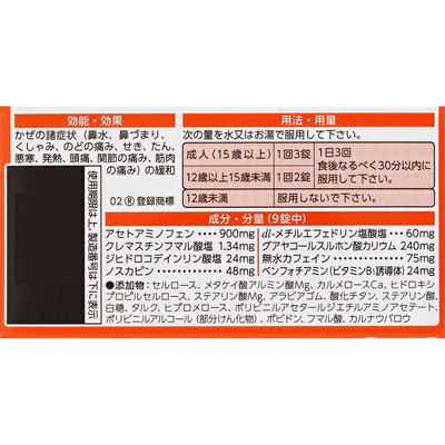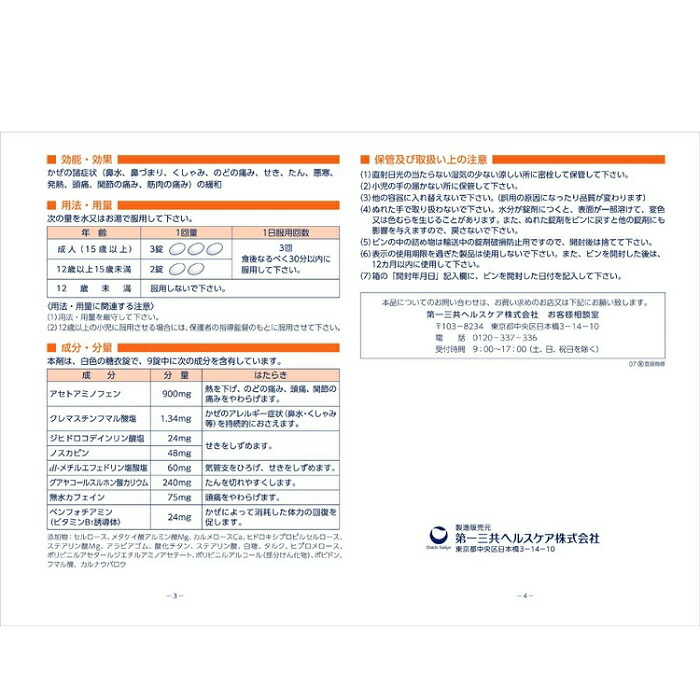 | ◆特 長◆ かぜの11症状すべてにすぐれた効き目を発揮する、家庭の常備薬 「アセトアミノフェン」がのどの痛み・発熱にすぐれた効果を発揮 鼻水・鼻づまりには「クレマスチンフマル酸塩」が効果を発揮 「ノスカピン」と「ジヒドロコデインリン酸塩」がダブルの効果でせきをしずめる お薬の苦手な方でも服用しやすい苦味のない小粒の糖衣錠 ◆メーカー◆ 第一三共ヘルスケア株式会社 〒103-8234 東京都中央区日本橋3-14-10 お客様相談室 0120-337-336 受付時間 9:00~17:00(土、日、祝日を除く) ※製造国または原産国:日本 ◆効能・効果◆ かぜの諸症状(鼻水、鼻づまり、くしゃみ、のどの痛み、せき、たん、悪寒、発熱、頭痛、関節の痛み、筋肉の痛み)の緩和 ◆用法・用量◆ 次の量を水又はお湯で服用して下さい。食後なるべく30分以内に服用して下さい。 成人(15歳以上) 1回3錠、1日3回 12歳以上15歳未満 1回2錠、1日3回 12歳未満は服用しないで下さい。 ・用法・用量に関連する注意 (1)用法・用量を厳守して下さい。 (2)12歳以上の小児に服用させる場合には、保護者の指導監督のもとに服用させて下さい。 ◆成分・分量◆ 9錠中 アセトアミノフェン:900mg クレマスチンフマル酸塩:1.34mg ジヒドロコデインリン酸塩:24mg ノスカピン:48mg dl-メチルエフェドリン塩酸塩:60mg グアヤコールスルホン酸カリウム:240mg 無水カフェイン:75mg ベンフォチアミン(ビタミンB1誘導体):24mg 添加物としてセルロース、メタケイ酸アルミン酸Mg、カルメロースCa、ヒドロキシプロピルセルロース、ステアリン酸Mg、アラビアゴム、酸化チタン、ステアリン酸、白糖、タルク、ヒプロメロース、ポリビニルアセタールジエチルアミノアセテート、ポリビニルアルコール(部分けん化物)、ポビドン、フマル酸、カルナウバロウを含有する。 ◆使用上の注意◆ ●してはいけないこと(守らないと現在の症状が悪化したり、副作用・事故が起こりやすくなります) 1. 次の人は服用しないで下さい。 (1)本剤又は本剤の成分によりアレルギー症状を起こしたことがある人 (2)本剤又は他のかぜ薬、解熱鎮痛薬を服用してぜんそくを起こしたことがある人 (3)12歳未満の小児 2. 本剤を服用している間は、次のいずれの医薬品も使用しないで下さい。 他のかぜ薬、解熱鎮痛薬、鎮静薬、鎮咳去痰薬、抗ヒスタミン剤を含有する内服薬等(鼻炎用内服薬、乗物酔い薬、アレルギー用薬等) 3. 服用後、乗物又は機械類の運転操作をしないで下さい。(眠気等があらわれることがあります) 4. 授乳中の人は本剤を服用しないか、本剤を服用する場合は授乳を避けて下さい。 5. 服用前後は飲酒しないで下さい。 6. 長期連用しないで下さい。 ●相談すること 1. 次の人は服用前に医師、薬剤師又は登録販売者に相談して下さい。 (1)医師又は歯科医師の治療を受けている人 (2)妊婦又は妊娠していると思われる人 (3)高齢者 (4)薬などによりアレルギー症状を起こしたことがある人 (5)次の症状のある人 高熱、排尿困難 (6)次の診断を受けた人 甲状腺機能障害、糖尿病、心臓病、高血圧、肝臓病、腎臓病、胃・十二指腸潰瘍、緑内障、呼吸機能障害、閉塞性睡眠時無呼吸症候群、肥満症 2. 服用後、次の症状があらわれた場合は副作用の可能性がありますので、直ちに服用を中止し、添付文書を持って医師、薬剤師又は登録販売者に相談して下さい。 ・皮膚:発疹・発赤、かゆみ ・消化器:吐き気・嘔吐、食欲不振 ・精神神経系:めまい、興奮、けいれん ・泌尿器:排尿困難 ・その他:過度の体温低下 まれに下記の重篤な症状が起こることがあります。その場合は直ちに医師の診療を受けて下さい。 ・ショック(アナフィラキシー):服用後すぐに、皮膚のかゆみ、じんましん、声のかすれ、くしゃみ、のどのかゆみ、息苦しさ、動悸、意識の混濁等があらわれる。 ・皮膚粘膜眼症候群(スティーブンス・ジョンソン症候群):高熱、目の充血、目やに、唇のただれ、のどの痛み、皮膚の広範囲の発疹・発赤、赤くなった皮膚上に小さなブツブツ(小膿疱)が出る、全身がだるい、食欲がない等が持続したり、急激に悪化する。 ・中毒性表皮壊死融解症:高熱、目の充血、目やに、唇のただれ、のどの痛み、皮膚の広範囲の発疹・発赤、赤くなった皮膚上に小さなブツブツ(小膿疱)が出る、全身がだるい、食欲がない等が持続したり、急激に悪化する。 ・急性汎発性発疹性膿疱症:高熱、目の充血、目やに、唇のただれ、のどの痛み、皮膚の広範囲の発疹・発赤、赤くなった皮膚上に小さなブツブツ(小膿疱)が出る、全身がだるい、食欲がない等が持続したり、急激に悪化する。 ・薬剤性過敏症症候群:皮膚が広い範囲で赤くなる、全身性の発疹、発熱、体がだるい、リンパ節(首、わきの下、股の付け根等)のはれ等があらわれる。 ・肝機能障害:発熱、かゆみ、発疹、黄疸(皮膚や白目が黄色くなる)、褐色尿、全身のだるさ、食欲不振等があらわれる。 ・腎障害:発熱、発疹、尿量の減少、全身のむくみ、全身のだるさ、関節痛(節々が痛む)