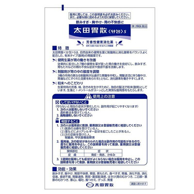 | ◆特 長◆ 太田胃散 分包 Sは、自然由来の健胃生薬に制酸剤と消化酵素をバランスよく配合した、粉末タイプ(散剤)の胃腸薬です。 ◆メーカー◆ 株式会社太田胃散 東京都文京区千石2-3-2 お客様相談室: (03)3944-1311 受付時間: 9:30~17:00(土、日、祝日等を除く) ※製造国または原産国:日本 ◆効能・効果◆ 飲みすぎ、胸やけ、胃部不快感、胃弱、胃もたれ、食べすぎ、胃痛、消化不良、消化促進、食欲不振、胃酸過多、胃部・腹部膨満感、 はきけ(胃のむかつき、二日酔・悪酔のむかつき、悪心)、嘔吐、胸つかえ、げっぷ、胃重 ◆用法・用量◆ 次の量を食後又は食間に水又はぬるま湯で服用してください。 成人(15歳以上) 1回1包、1日3回 8~14歳 1回1/2包、1日3回 8歳未満は服用しないこと ※食間とは食後2~3時間のことをいいます。 ・用法・用量に関連する注意 小児に服用させる場合には、保護者の指導監督のもとに服用させてください。 ・散剤がのみにくい場合 (1)適量の水又はぬるま湯を口に含み、薬を口の中に入れます。 (2)舌で2~3回混ぜてからのみますと、服用しやすくなります。 ◆成分・分量◆ 1日量(3包)中 健胃生薬:ケイヒ:276mg、ウイキョウ:72mg、ニクズク:60mg、チョウジ:36mg、チンピ:66mg、ゲンチアナ:45mg、ニガキ末:45mg 制酸剤:炭酸水素ナトリウム:1875mg、沈降炭酸カルシウム:980mg、合成ヒドロタルサイト:300mg 消化酵素:ビオヂアスターゼ:135mg 添加物としてl-メントール、炭酸mgを含有する。 ◆使用上の注意◆ ・してはいけないこと (守らないと現在の症状が悪化したり、副作用が起こりやすくなります) 1. 次の人は服用しないでください 透析療法を受けている人。 2. 長期連用しないでください ・相談すること 1. 次の人は服用前に医師、薬剤師又は登録販売者に相談してください (1)医師の治療を受けている人。 (2)薬などによりアレルギー症状を起こしたことがある人。 (3)次の診断を受けた人。 腎臓病、甲状腺機能障害 2. 服用後、次の症状があらわれた場合は副作用の可能性があるので、直ちに服用を中止し、この説明書を持って医師、薬剤師又は登録販売者に相談してください 皮膚:発疹・発赤、かゆみ 3. 2週間位服用しても症状がよくならない場合は服用を中止し、この説明書を持って医師、薬剤師又は登録販売者に相談してください ◆保管及び取扱い上の注意◆ (1)直射日光の当たらない湿気の少ない涼しい所に保管してください。 (2)小児の手の届かない所に保管してください。 (3)他の容器に入れ替えないでください。 (誤用の原因になったり品質が変わることがあります。) (4)1包を分割した残りを服用する場合には、袋の口を折り返して保管し、2日以内に服用してください。 (5)使用期限を過ぎた製品は服用しないでください。 ※その他、医薬品は使用上の注意をよく読んだ上で、それに従い適切に使用して下さい。 |