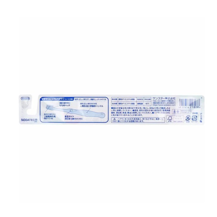 | ◆特 長◆ 星型ガイドで親指を置く位置がわかりやすく、自然に正しい持ち方ができる人間生活工学に基づいたハンドル設計のこどもハブラシです。 奥歯もしっかりみがけるななめヘッドを採用でお子さまの歯みがき習慣をサポートします。 やわらかいのに毛がひらきにくい2倍長持ち毛(同メーカー製ナイロン毛比)採用。 6~12才用 ・ハブラシの色はお選びいただけません。 ◆メーカー(※製造国または原産国)◆ サンスター株式会社 ※製造国または原産国:日本 ◆ご使用方法◆ 毛先を上手に使って、軽く小刻みに磨いてください。 ◆成分、素材◆ 柄の材質:飽和ポリエステル樹脂 毛の材質:飽和ポリエステル樹脂 毛のかたさ:やわらかめ 耐熱温度:80度 ◆使用上の注意◆ 歯みがき後は毛の根元まで充分洗い落とし、水をよく切って風通しのよい所に保管してください。 変色、変形の恐れがありますので、塩素系殺菌剤、漂白剤、熱湯、精油は使用しないでくたさい。 ハブラシを強くかむと毛が抜けたリ折れることがあります。 ハブラシをくわえたまま遊ぶ、歩くなどすると、転倒した際にケガをする危険があります。 毛先がひらいたらとりかえましょう。 ・保護者の皆様へ:お子様がハブラシを使う際の注意事項 ハブラシをくわえたまま遊ぶ、歩くなどすると、転倒した際にケガをする危険があります。小さなお子様がハブラシを使用される場合は、必ず保護者の方が付き添い、目を離さないでいてください。 ハブラシを強くかむと毛が抜けたり、折れたりすることがありますので、歯みがきの習慣づけの際は、ハブラシを噛まないようご指導ください。 |